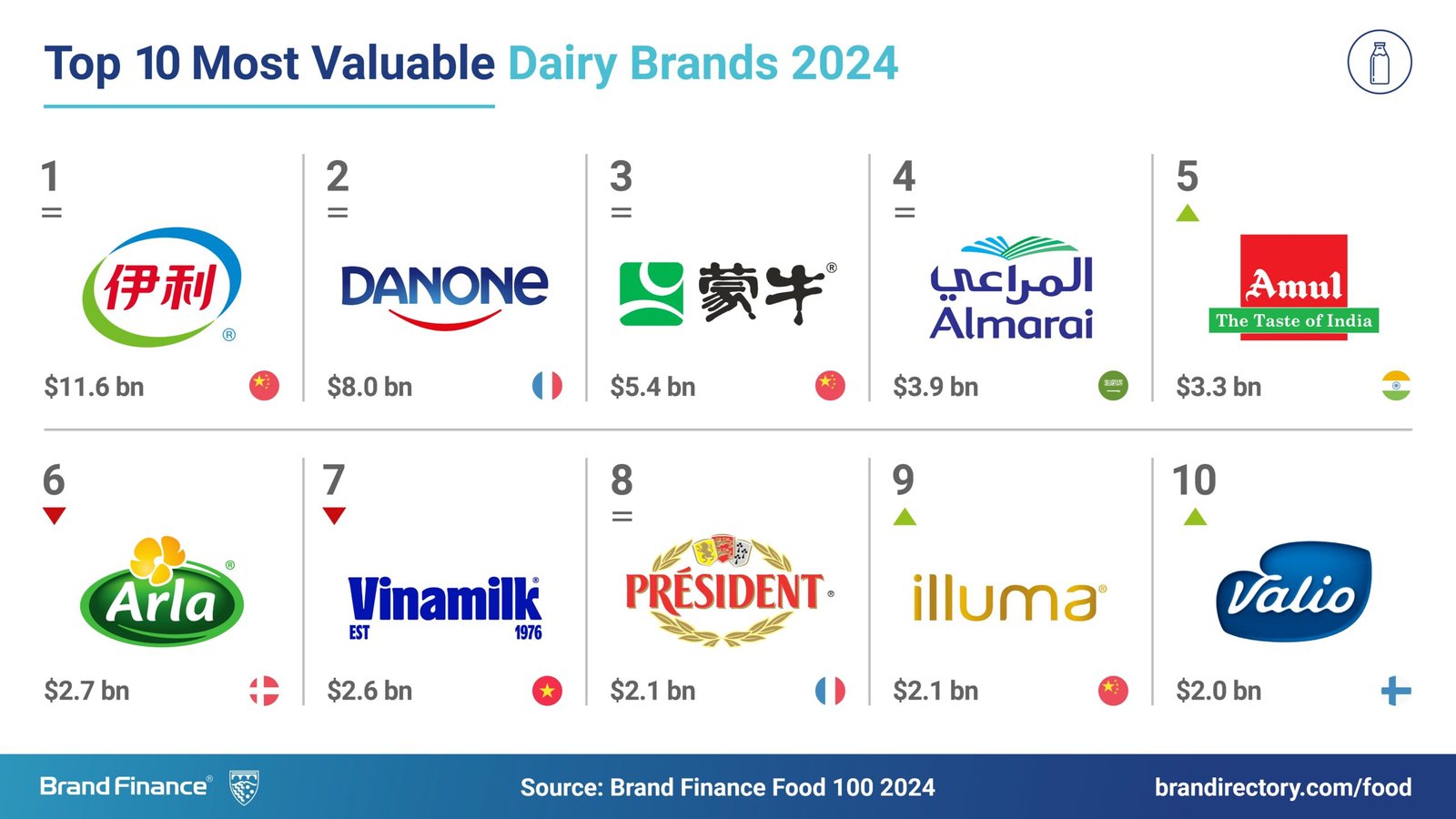 Yili (brand value down 6 per cent to $11.6 billion) continues to hold the title of the world’s most valuable dairy brand for the fifth consecutive year, according to a new report from leading brand valuation consultancy, Brand Finance.